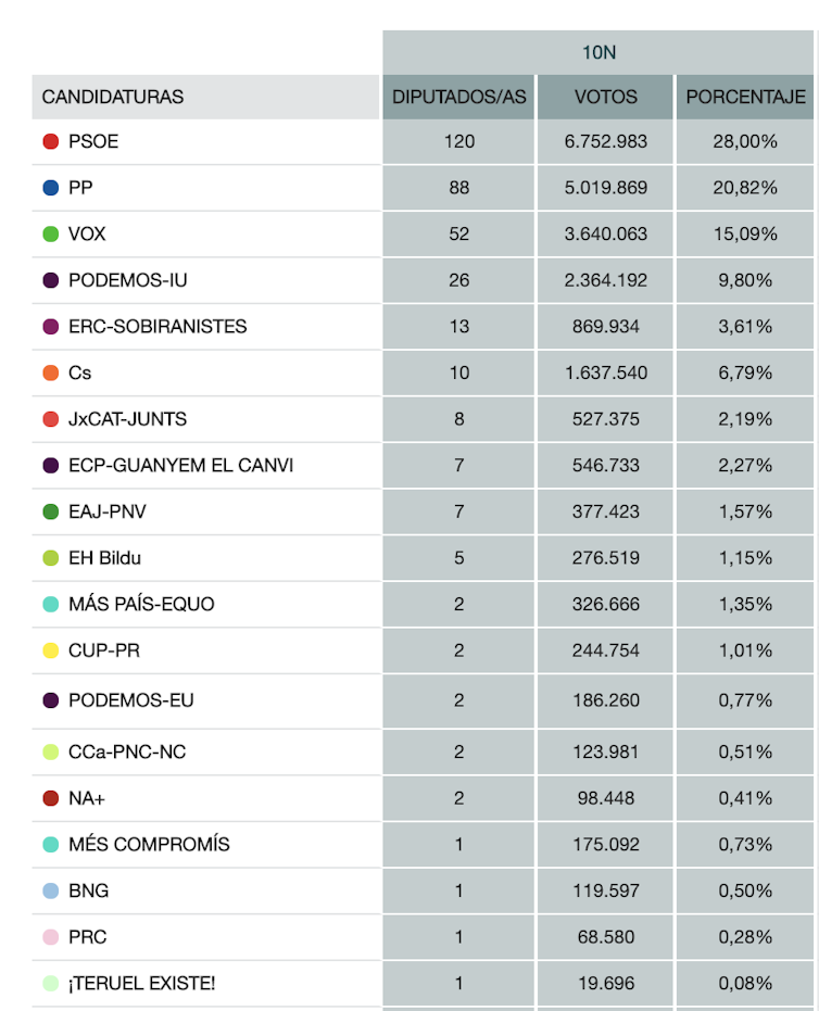 El 10N ofrece un enorme castigo a Ciudadanos y un incremento de Vox. El PSOE ha perdido más de 700 000 votos y el PP ha recuperado 22 escaños.
