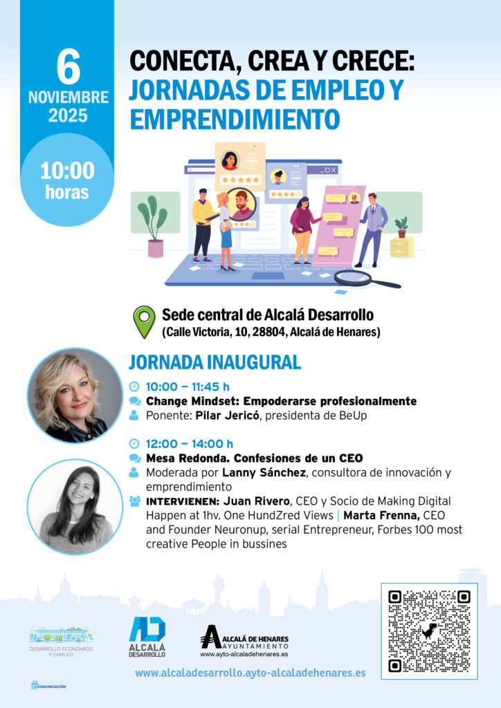 El próximo miércoles 6 de noviembre se celebrará en Alcalá de Henares la inauguración de “Conecta, crea y crece: jornadas de empleo y emprendimiento”, un programa formativo impulsado por Alcalá Desarrollo que ofrecerá talleres y conferencias gratuitas dirigidas a personas desempleadas, emprendedoras o en transición profesional.