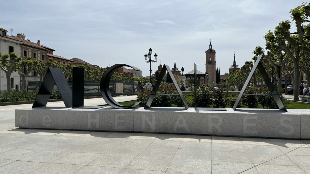 La renovación de la plaza incluye también nuevos elementos distintivos, como la instalación del nombre de Alcalá de Henares en grandes letras de acero pulido y la firma de Cervantes en bronce en el pavimento frente a su estatua.
