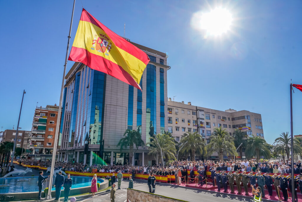 Este año el acto incluyó un desfile aéreo, exhibiciones de unidades militares y un salto paracaidista sobre la explanada, justo en la rotonda que tiene la Bandera de España frente a las estación de tren y autobuses.