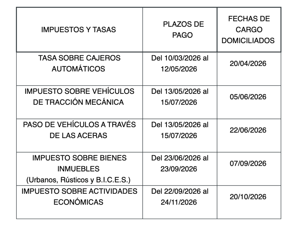 El Ayuntamiento recuerda que los impuestos y tasas citados anteriormente pueden ser domiciliados. La domiciliación supone el cargo de un tributo en la cuenta del contribuyente dentro del periodo voluntario de pago, según la fecha que se fije cada año en el calendario fiscal. Los tributos que pueden ser domiciliados son: Impuesto sobre bienes inmuebles (IBI), Impuesto sobre vehículos de tracción mecánica (IVTM), Impuesto sobre actividades económicas (IAE), Paso de Vehículos a través de las aceras (Vados), así como la Tasa sobre cajeros automáticos.