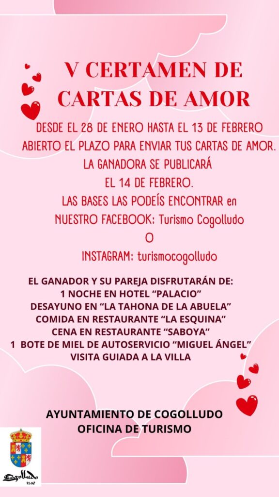 El Ayuntamiento de Cogolludo, a través de su Oficina de Turismo, ha puesto en marcha el V Certamen de Cartas de Amor y Desamor, una propuesta que busca fomentar la creatividad literaria y celebrar el amor en todas sus formas con motivo de San Valentín.