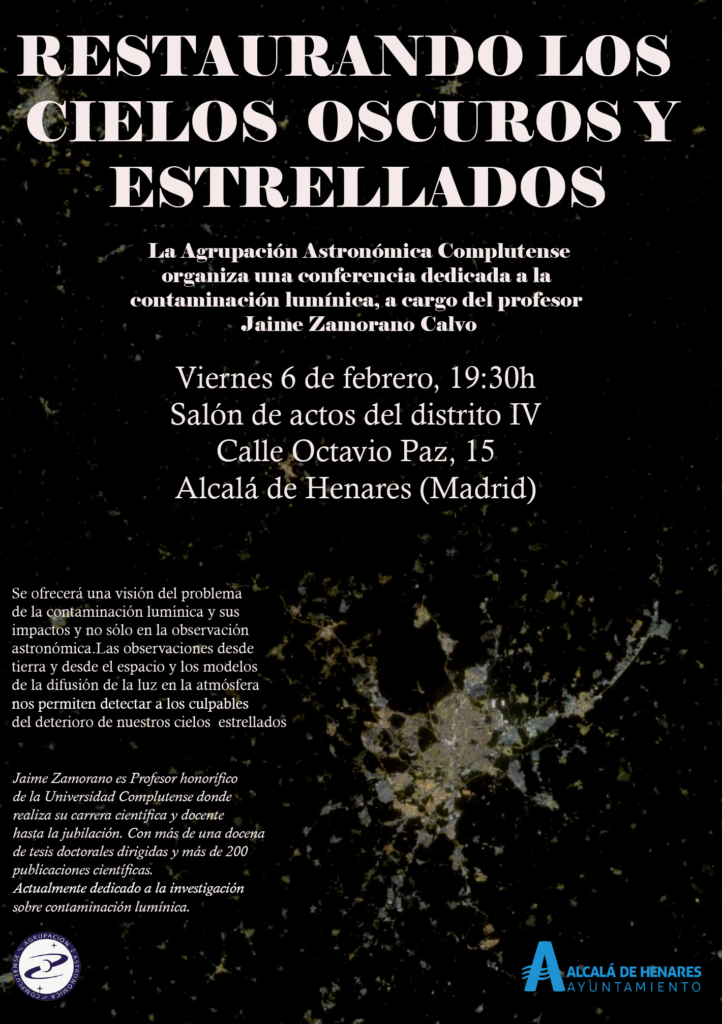 La Agrupación Astronómica Complutense organiza la conferencia ‘Restaurando los cielos oscuros y estrellado’ descubriremos como es y a que afecta la contaminación lumínica. Será el próximo viernes 6 de febrero a las 19,30 horas en el salón de actos de la Junta Municipal del Distrito IV (calle Octavio Paz, 15). Allí se dará una visión del problema de la contaminación lumínica y sus impactos y no solo en la observación astronómica.