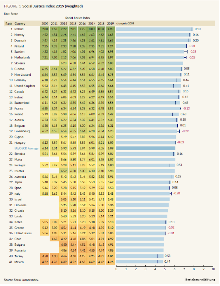 Esta imagen nos ofrece el índice ponderado de justicia social correspondiente al año 2019 y su evolución desde el 2009 en los 41 países participantes. El primer lugar lo ocupa Islandia, con una calificación de 7,90 en el año 2019, mientras que México ocupa la ultima posición con un 4,76. España se encuentra en la posición 28 con una nota de 5,53, por debajo de la nota media, que se sitúa en 6,09.![]()