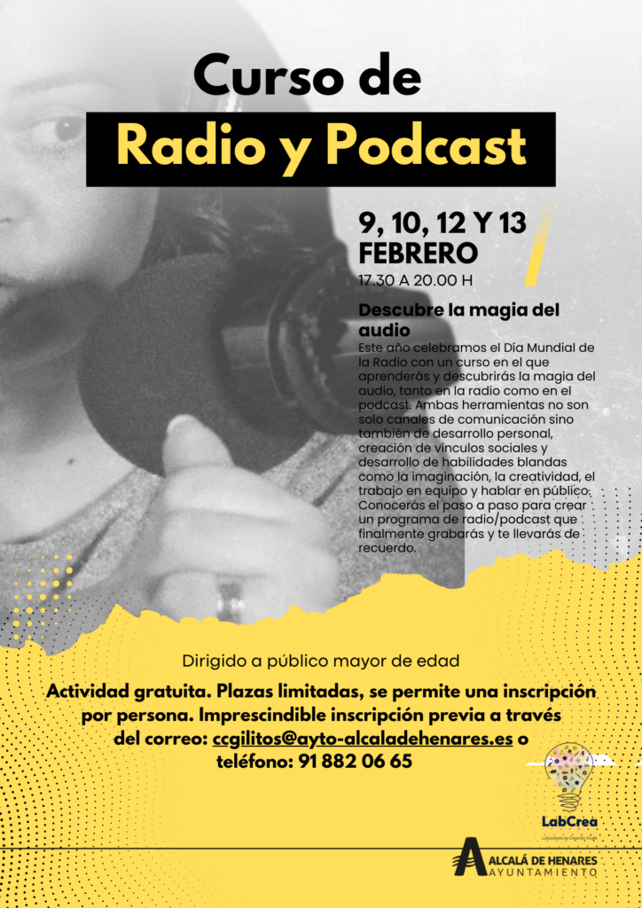 Así que, si siempre has tenido curiosidad por conocer de cerca de este medio de comunicación, quieres vivir la experiencia de crear un programa y ver cómo quedaría grabado con tu voz no dejes pasar esta oportunidad que te ofrece el laboratorio de Creación Alcalá (LabCrea) y apúntate que las plazas vuelan.