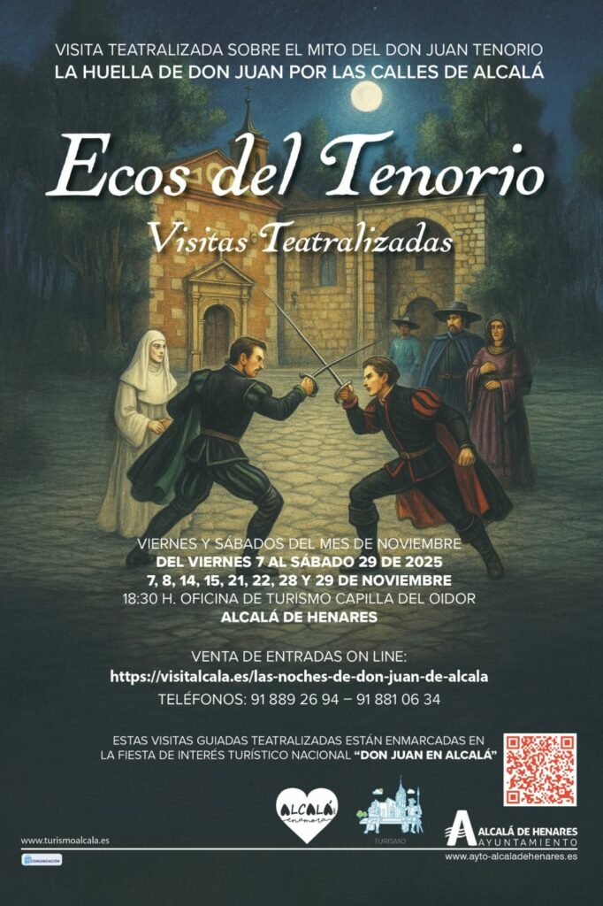 Todos los viernes y sábados, del 7 al 29 de noviembre, volverán a las calles de la ciudad complutense las visitas teatralizadas en torno a la figura del Tenorio ‘Los ecos del Tenorio’.
