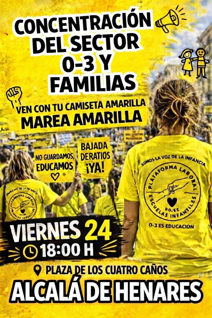 Concentración este viernes de todas las Escuelas Infantiles de gestión directa e indirecta privadas y escuelas dentro de los CEIPS de Alcalá de Henares . El sector reclama la bajada de ratios, mejores condiciones laborales y el reconocimiento educativo de la etapa Alcalá de Henares, 15 de Abril de 2026 Profesionales del primer ciclo de Educación Infantil (0-3 años) han convocado una concentración el próximo viernes 24 a las 18:00 horas en la Plaza de los Cuatro Caños de Alcalá de Henares para visibilizar la situación del sector y exigir mejoras urgentes. Bajo el lema “Marea Amarilla”, las educadoras y educadores hacen un llamamiento a la ciudadanía para acudir con camiseta amarilla y mostrar su apoyo a una etapa educativa clave.