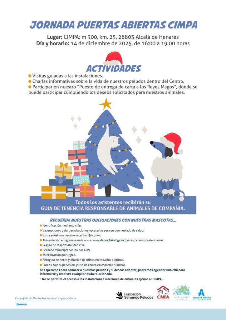 La Concejalía de Medio Ambiente del Ayuntamiento de Alcalá de Henares recuerda que en estas fechas es importante hacer hincapié en que los animales no son un juguete ni un regalo más bajo el árbol. Son compañía, cariño, lealtad… y también una responsabilidad que dura toda la vida.