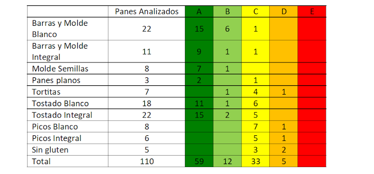 El principal resultado del trabajo es que los panes obtendrían una clasificación muy positiva en el etiquetado Nutriscore: la mayoría de las barras y panes de molde pertenecería a los grupos A o B, los de mayor calidad nutricional.