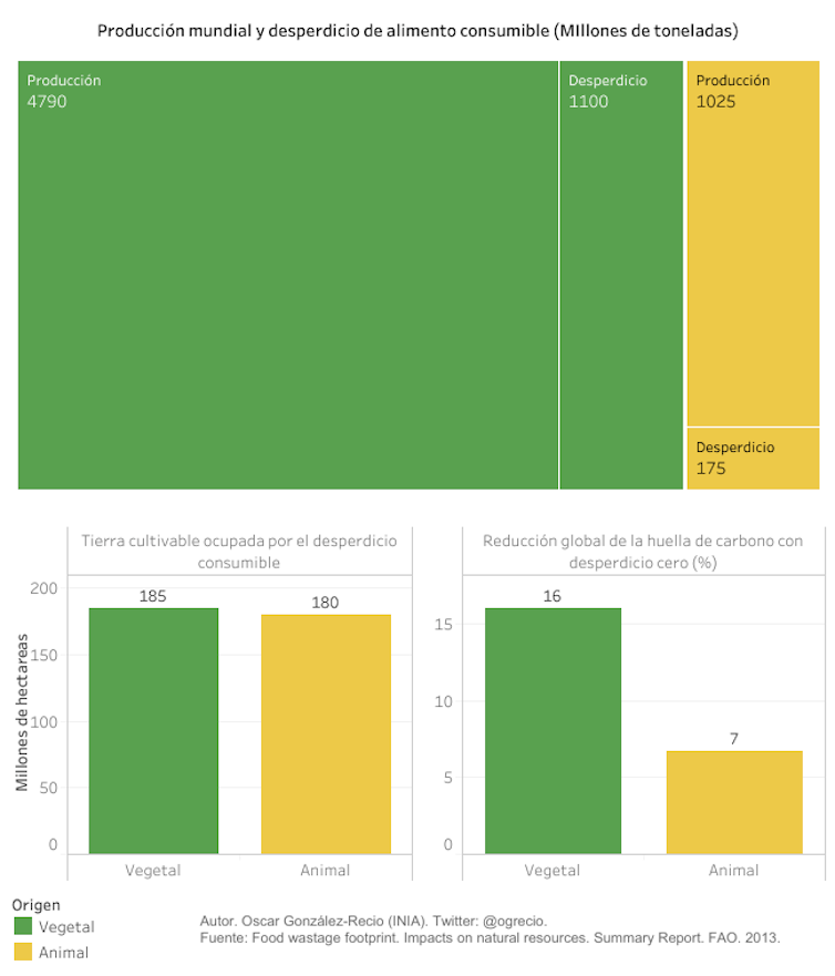 El uso de tierra arable es similar en los productos de origen vegetal y animal. Entre ellos, los cereales, la carne y la leche son los que mayores superficie cultivable ocupan. Una reducción total del desperdicio de los alimentos supondría reducir un 23 % las emisiones totales de gases de efecto invernadero provenientes de la agricultura y la ganadería.