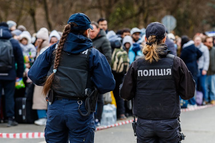Policías ante una fila de refugiados ucranianos que tratan de salir de su país por la frontera con Eslovaquia en Uzhgorod el 26 de febrero de 2022. Shutterstock / Yanosh Nemesh.