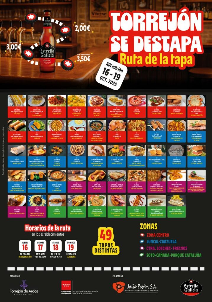 Torrejón de Ardoz volverá a convertirse en la capital del sabor con la celebración de la XVI edición de la Ruta de la Tapa “Torrejón se desTapa”, en la que participan 49 establecimientos y cada uno de ellos creará una tapa de cocina especialmente diseñada para su participación en la Ruta, compitiendo así por alzarse con el galardón a la mejor tapa del año en esta iniciativa creada para apoyar y dinamizar la hostelería de la ciudad. Además, este año se ha atendido la petición de los hosteleros participantes y no hay ningún evento gastronómico, organizado por el Ayuntamiento, que coincida durante los días que se celebra esta exitosa iniciativa.