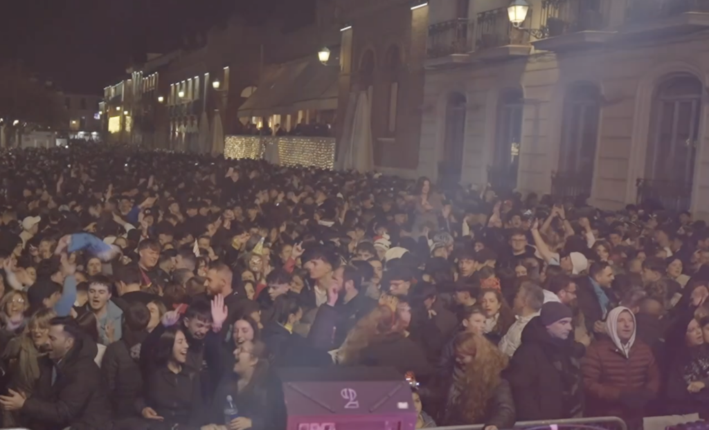 A las 00,00 horas llegó el plato fuerte con las 12 campanadas y 12 gomiuvas que vendían las peñas de Alcalá de forma solidaria en favor de Claudia y Leo. El dinero fue a parar esta vez a dos causas solidarias. Por un lado, Claudia, quien convive con dos enfermedades raras, el síndrome de Angelman y el síndrome de Lennox-Gastaut. Actualmente, es la única niña de la que se tiene constancia que conviva con ambas patologías, lo que hace imprescindible un elevado número de terapias especializadas que su familia necesita seguir sufragando.