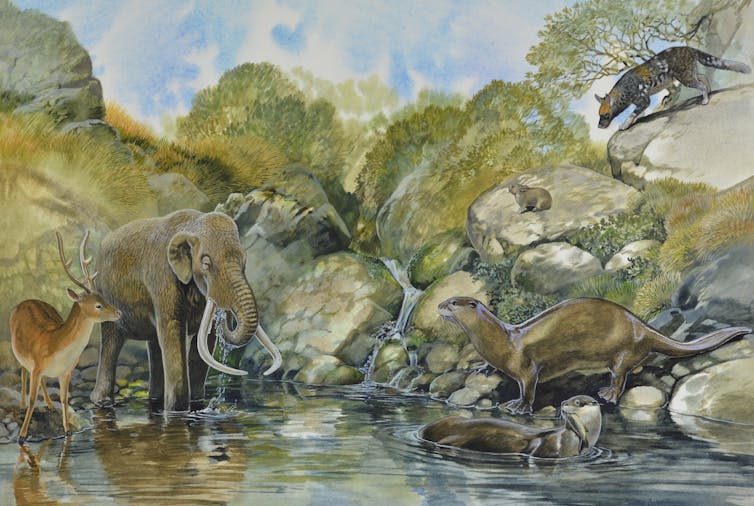 Ilustración del elefante enano, la nutria gigante, el ciervo, el perro salvaje y la pica gigante que habitaron Cerdeña hace miles de años. Peter Schouten / iDiv.