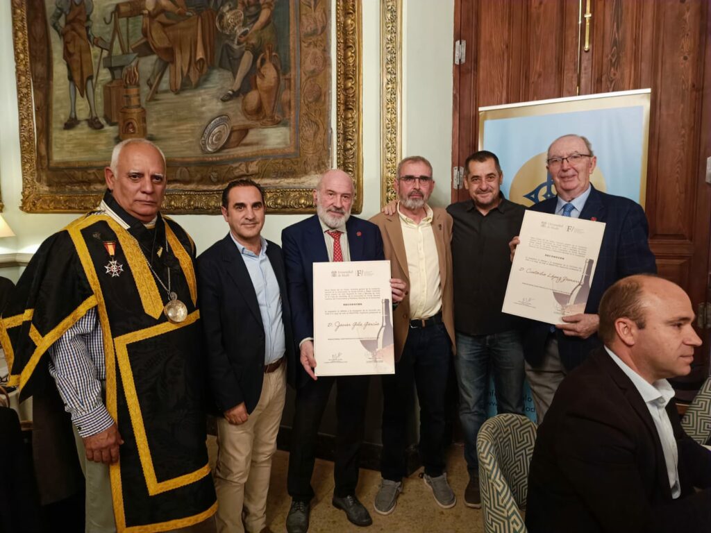 El “Aula Magistral de Cata y Maridaje de Vinos en la Cuna de Cervantes” de la Universidad de Alcalá, dirigida por el profesor Cambralla, entregó este mes que terminó a los ilustres y prestigiosos sumilleres D. Custodio López Zamarra (Restaurante Zalacaín) y D. Javier Gila García (Hotel Ritz y Hotel Villa Magna) el “Pergamino de Reconocimiento Francisco (Gonzalo) Ximénez de Cisneros” al magisterio, la defensa y la divulgación de la Cultura del Vino, a lo largo de su dilatada y magnífica trayectoria profesional.