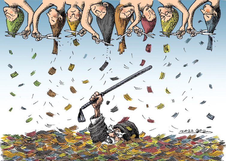Desde el 16 de septiembre, las mujeres luchan no solo contra la obligatoriedad del pañuelo, sino contra todo lo que representa: luchan por el derecho a decidir sobre sus vidas y sobre sus cuerpos. El campo de batalla se ha establecido de una forma muy evidente en las calles, donde en símbolo de protesta, aupadas y respaldadas por sus compañeros, las mujeres iraníes se cortan el cabello y desafían las fuerzas de la ley.