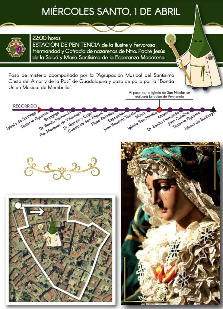 La Semana Santa congrega cada año a miles de guadalajareños y de forasteros para presenciar los solemnes pasos procesionales de las Cofradías y Hermandades de Guadalajara. Este Miércoles Santo es turno para una de las imágenes más veneradas de la ciudad, la Esperanza Macarena. Saldrá a las 22 horas desde la Iglesia de Santiago.