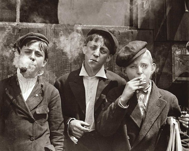 Jóvenes repartidores de periódicos en una pequeña pausa mientras fuman sus cigarrillos. 1910, St. Louis. Lewis Hine. Biblioteca del Congreso de Estados Unidos.