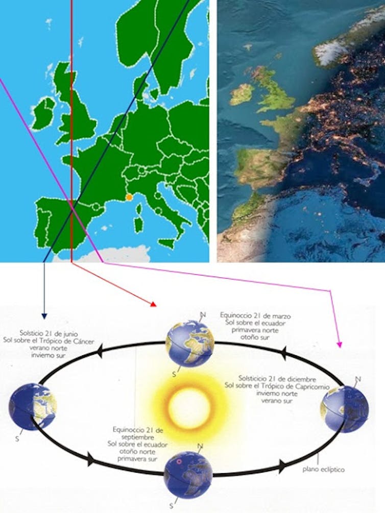 El movimiento de la Tierra alrededor del Sol hace que a lo largo del año cambie el conjunto de lugares en los que anochece a la vez (el “terminador”, que se dice cuando se observa desde fuera del planeta). En verano amanece a la vez en Pamplona, París y Copenhague (ver línea azul del gráfico). En invierno, para cuando amanece en Pamplona lo hizo antes en París y antes aún en Copenhague.