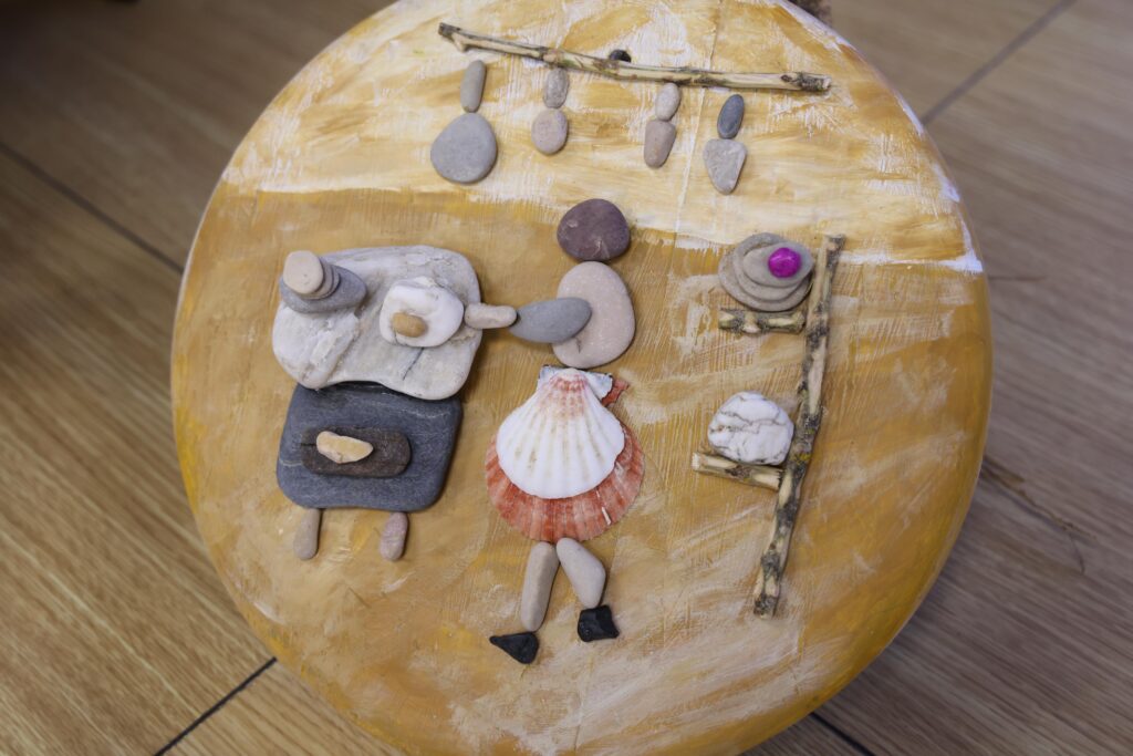La exposición reúne trabajos realizados desde 2020 hasta la actualidad, con un sello muy personal basado en el llamado arte de guijarros. Mayte busca piedras en cualquier lugar, las selecciona por su forma y las integra en composiciones sobre soportes preparados artesanalmente. “Recojo piedras de donde encuentro y luego las plasmo en cuadritos. Todo es reciclado, no compro nada, utilizo lo que tengo”, explica la autora, que reconoce que su proceso creativo parte a veces de ideas que consulta en tutoriales, pero siempre culmina en una pieza única. “Al final le das tu toque personal; aunque se parezca a lo que has visto, lo que haces es tuyo”.