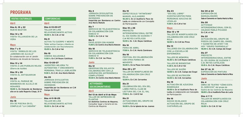 El programa incluye una amplia variedad de propuestas que abarcan visitas culturales, conferencias, actividades sociocomunitarias, rutas medioambientales y talleres formativos. Entre ellas, destacan excursiones a Nuevo Baztán, la Vera o la Sierra de Ayllón; talleres de salud, memoria y bienestar emocional; actividades intergeneracionales con centros educativos; y rutas por distintos espacios naturales del municipio.
