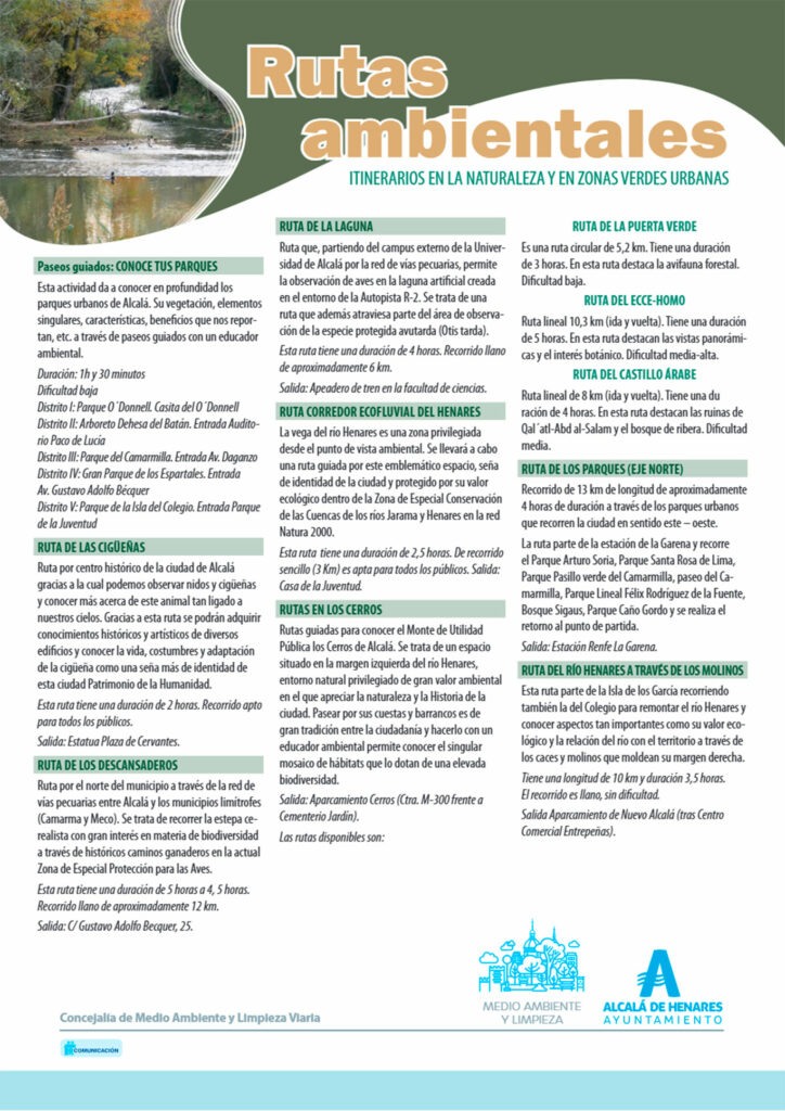 El programa, ya consolidado en la agenda ambiental de la ciudad, propone recorridos por algunos de los espacios naturales y zonas verdes más representativos de Alcalá de Henares, como el entorno del río Henares, los cerros, humedales, corredores ecológicos y parques urbanos. A través de estas actividades, el Ayuntamiento busca fomentar el conocimiento del medio natural y promover actitudes de respeto y conservación del entorno.