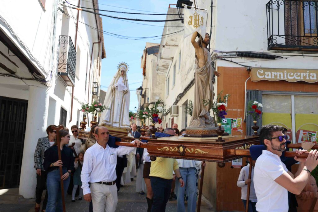 Como es tradición, los hombres han portado la imagen de Jesús saliendo por la Puerta del Sol de la iglesia, mientras que las mujeres han acompañado a la Virgen desde la Puerta Norte. Ambas comitivas se han encontrado en un punto del recorrido, donde se ha retirado el manto de luto a la Virgen en un gesto cargado de simbolismo, antes de continuar juntas en procesión entre cánticos populares.