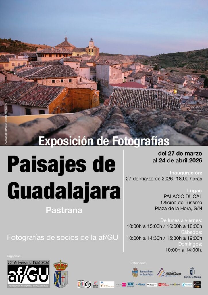 El Ayuntamiento de Pastrana informa de la próxima inauguración de la exposición fotográfica “Paisajes de Guadalajara”, organizada por la Agrupación Fotográfica de Guadalajara, que abrió sus puertas el viernes, 27 de marzo en el Palacio Ducal de Pastrana (Plaza de la Hora, s/n), donde la muestra podrá visitarse hasta el 24 de abril de 2026.