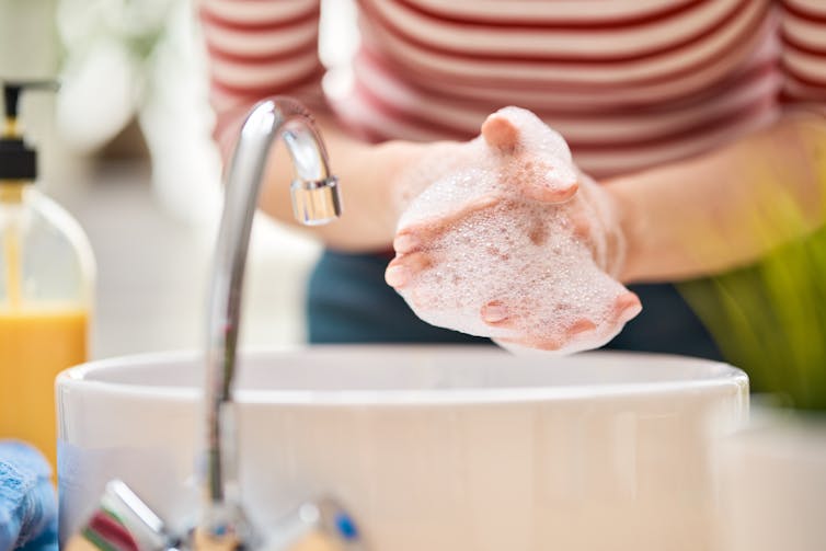 Es fundamental restregar y friccionar la espuma por el dorso y la palma de las manos, entre los dedos y debajo de las uñas. La espuma jabonosa genera micelas –esferas de jabón– que atrapan y eliminan la suciedad, los microbios y las sustancias químicas nocivas.