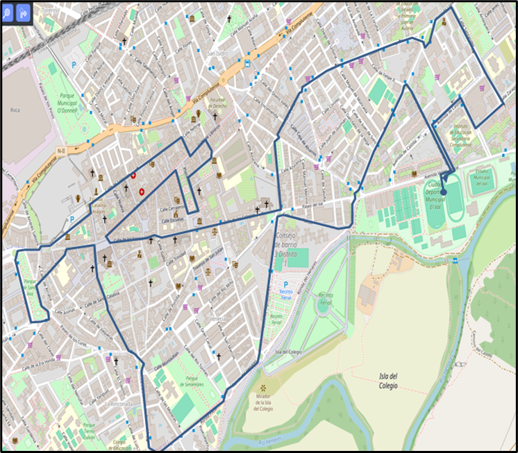 Polideportivo Val – Avenida Virgen del Val – C/Salamanca – Avd. Lope de Figueroa – Rotonda casa de la Juventud – Camino del Caz –  Calle Fernán Falcón – Gta. Aguadores – Paseo Aguadores – Ronda del Henares – Ronda Fiscal – Paseo Pastrana -Plaza Puerta del Vado – Paseo de los Curas – C/Damas – C/Tercia – Plaza Santos Niños – C/Cardenal Cisneros -C/Almazán – C/Andrés Saborit – Avd. Reyes Católicos  -C/Demetrio Ducar – Avd. de Madrid-Puerta Madrid -C/Cardenal Sandoval y Rojas – Plaza palacio  -Plaza de las Bernardas – C/Santiago – C/Tinte – C/Libreros – C/Beatas – Plaza de San Diego – C/Bustamante Cámara – Plaza Cervantes( lado circulo) – Puerta Ayuntamiento – C/Mayor – Plaza Santos Niños – C/Escritorios – C/Santa Úrsula – C/Colegios – Gta. Aguadores – C/Giner de los Ríos – C/Ronda Ancha –  Avd. Juan de Austria – Avd. Lope de Figueroa – C/Santander – C/Zaragoza – C/Valladolid – Avda. Castilla – C/Salamanca – Avd. Virgen del Val  – Polideportivo Val – Pistas de atletismo.