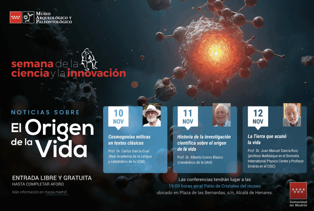 El Museo Arqueológico y Paleontológico de la Comunidad de Madrid celebra la Semana de la Ciencia y la Innovación con un ciclo de tres conferencias titulado Noticias sobre el origen de la vida, que reunirá a destacados expertos en filología, biología y geología. Las conferencias son de entrada libre y gratuita hasta completar aforo. Además, cada jornada incluirá al finalizar un espacio de preguntas para fomentar el diálogo entre los asistentes al evento.