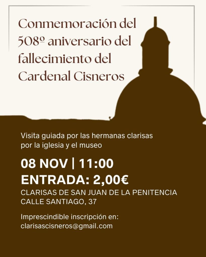Se trata de una visita guiada por la iglesia y el museo del Convento de San Juan de la Penitencia (Calle Santiago, 37) que llevarán a cabo las propias Hermanas Franciscanas Clarisas a las 11:00 horas, del mismo sábado 8 de noviembre. La visita tiene una donación de apenas 2 euros y es necesaria la inscripción previa en el e-mail: clarisascisneros@gmail.com